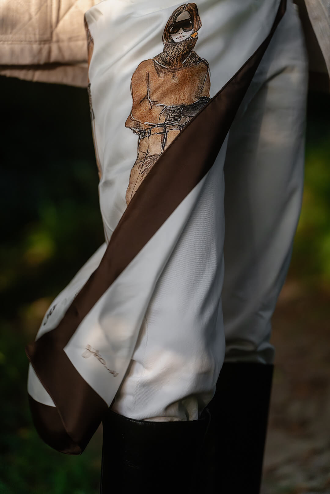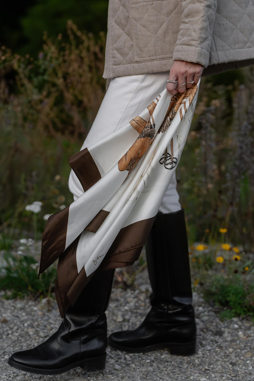 100 % Seide, maschinenrolliert, Rückseite wie Vorderseite bedruckt (doppelter Druck). Randeinfassung schokobraun.